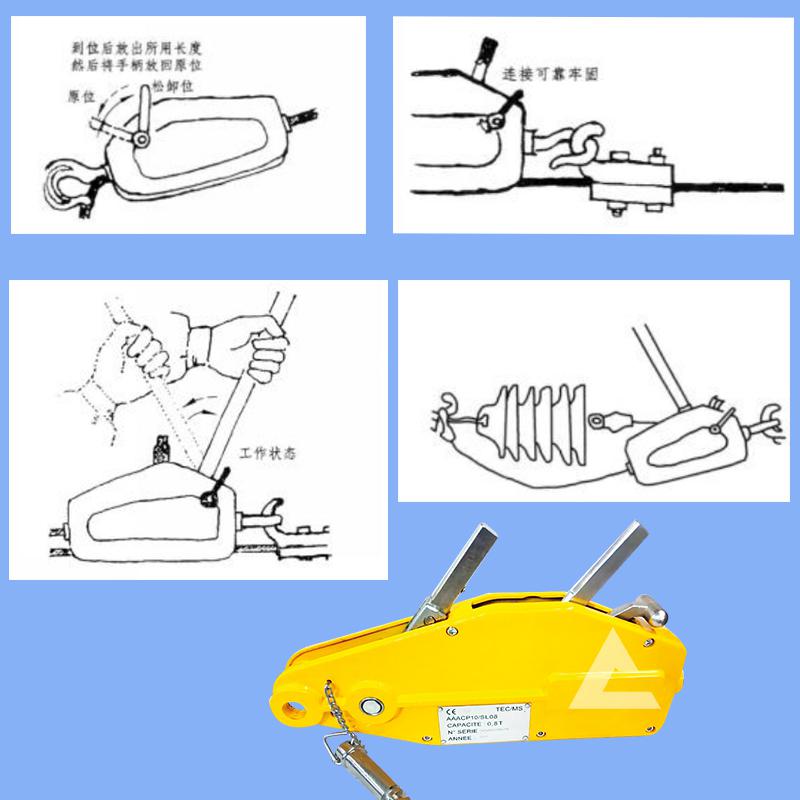 3.小型手扳葫蘆穿入鋼絲繩,放下松解手柄,扳到前進(jìn)手柄,開(kāi)始提升重物;